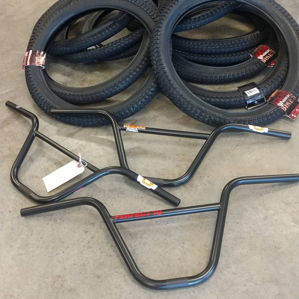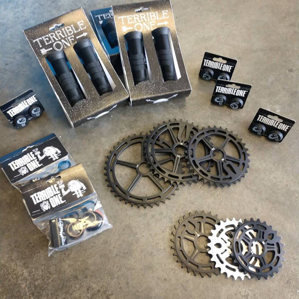 Got in a giant order from Terrible One today! Skapegoat and Ruben frames, a bunch of bars, sprockets, grips, bar ends, bottom brackets, tee shirts, hats, stickers, socks and coffee mugs!