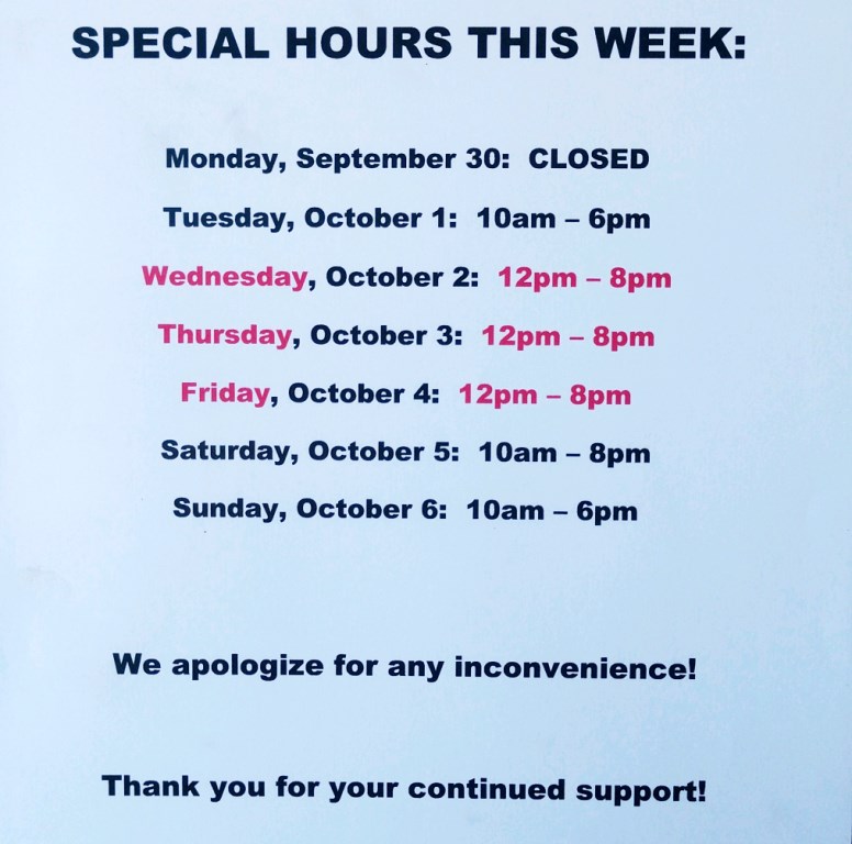 Please bear with us and thank you for your support!! Current hours are 12-5 Tuesday through Saturday.