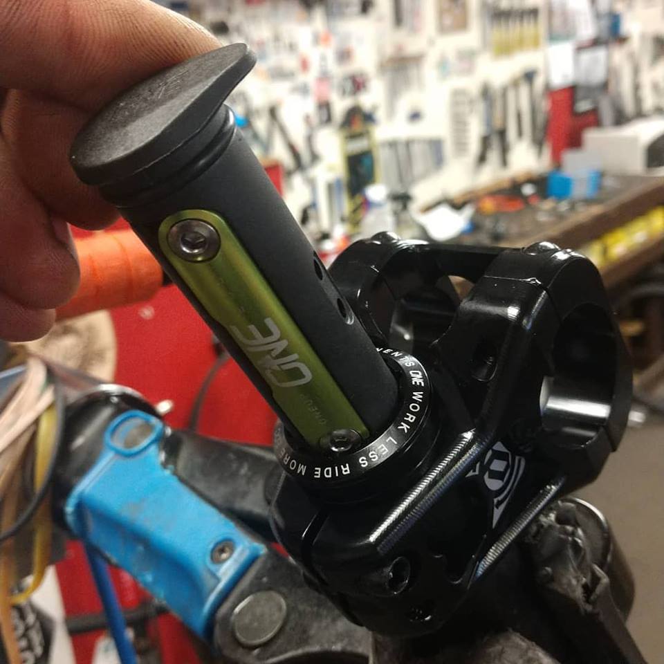 Wolf tooth with another killer in-bike tool storage solution! This setup fits inside most mountain or road bike handlebars. 14-function hex bit wrench/multi-tool on one side, chain and tire plug tool on the other side. Each is also available separately. Great stocking stuffer for the bike nerd that has everything!