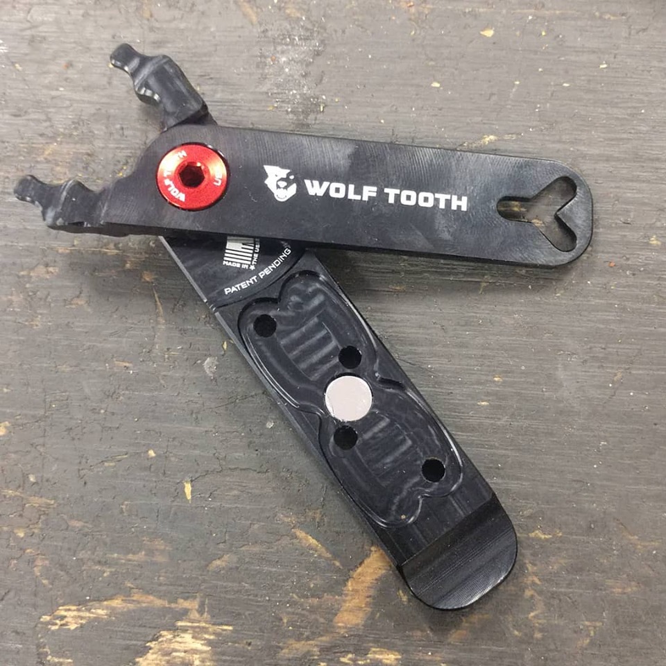 Wolf Tooth "Pack Pliers", fits a couple quick links which are held in place my a magnet, and functions as a tire lever, presta valve core remover, valve stem locknut plier and quick link plier. Light and compact, well thought out tool! In stock now!