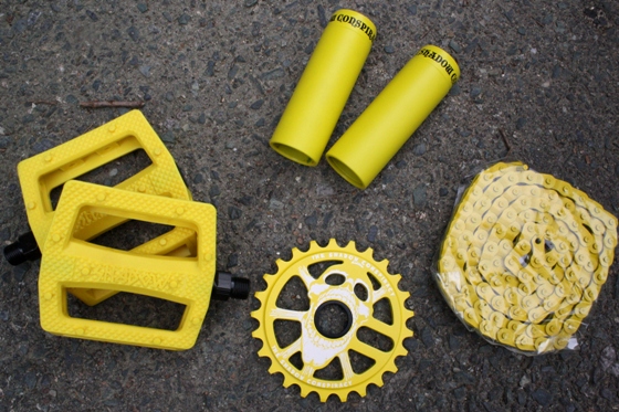 Fedex showed up late today, and in exchange for us microwaving his lunch for him, he gave us a big box of Shadow Conspiracy stuff: new shirts, yellow bars and hubs, and more chains, sprockets, pegs, pedals and bottom brackets... also got in a couple more Banned "Budsaw" sprockets, in 25 or 28t... nice!